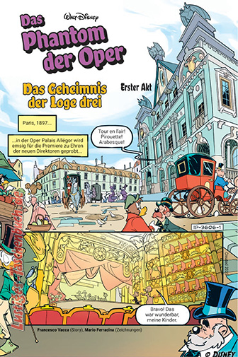 Entrez! Hereinspaziert! Eine besondere Premiere steht bevor im berühmten Opernhaus … sofern das rätselhafte Phantom nicht wieder einen Strich durch die Rechnung macht! Das Publikum rangelt sich bereits in den Rängen und purzelt durchs Parkett. Und hinter den Kulissen warten viele Mitwirkende auf ihren Einsatz, die für ein besonderes Opernerlebnis sorgen. Donald, der Pechvogel für alles, kennt sich bestens aus! Wer ist wer?