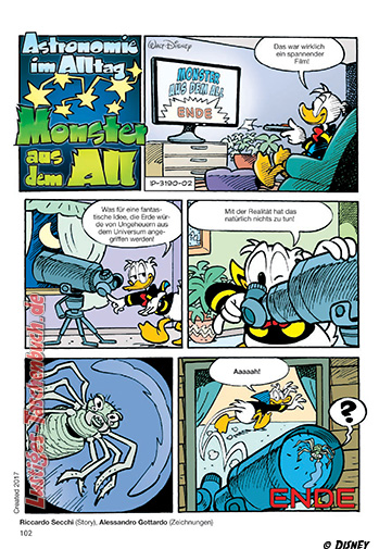 Auf dem Mond liegt die Zukunft der Menschheit und Rübenfreunde! Micky Maus erlebt diese Zukunft in seiner eigenen Gegenwart mit gravierenden Einflüssen aus der Vergangenheit. Und Micky ist eigentlich auch gar nicht der Micky, den wir kennen, sondern ein anderer Micky … Verwirrt? Dann unbedingt diese Ausgabe lesen. Außerdem treiben die Panzerknacker Schabernack im Weltall, die Ducks schlagen sich mit garstigen Gästen und Monstern aus dem All herum und Primus von Quack erkundet mit Donald Duck das Universum aus Tourismusperspektive. Im Weltall ist ganz schön was los. Die ca. 2,5 Millionen Lichtjahre entfernte Andromeda-Galaxie ist das am weitesten entfernte Objekt, das mit bloßem Auge gesehen werden kann. Die Nachbar-Galaxie erscheint als heller Nebel am Nachthimmel. Andromeda ist auf Kollisionskurs mit der Milchstraße und wird in 4 bis 10 Milliarden Jahren mit ihr verschmelzen.
